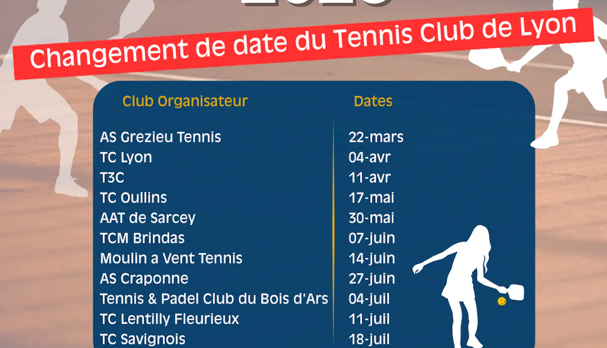 11 tournois de niveau K25 auront lieu de mars à juillet 2026 dans les clubs organisateurs du département du Rhône et de la Métropole de Lyon.